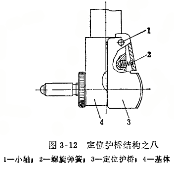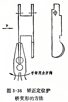 圖3—5、3—6、3—12和3—13所示的定位護橋,是用鋼板沖制而成,受到摔碰、擠壓或因修理方法不當,都會使護橋變形而造成定位誤差.這種情況一股可用整形的方法修復。修理方法如圖3—36所示,在環規內P向推動護橋時,若指針逆附針轉動,并有轉折點,可用手鉗將左側橋板按圖示力向矯正;反之則矯正右側橋板。矯正時只將兩片橋板向外側板正,以防止橋板與基體摩擦,造成定位護橋移動不靈活或卡住現象。