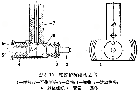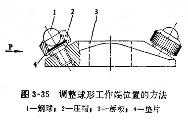圖3—9所示定位護橋的定位誤差主要是兩鋼球的高度不等造成的,可用調整球形工作端位置的方法修復(圖3—35)。調整前通過下述方法找出兩鋼球相對位置的高低:在環規內p向推動定位護橋時(圖3—29),若百分表指針逆時針轉動并有轉折點,則說明左側鋼球位置偏低;反之,說明右側鋼球位置偏低。這時可用墊高鋼球的方法進行調整。若左側鋼球偏低,則旋下壓帽2,在鋼球1的下面墊一墊片4。墊片的厚度通過試驗確定,一般可選用0.1一0.2毫米厚的鋼片沖制成圓形,以供修理中選用。