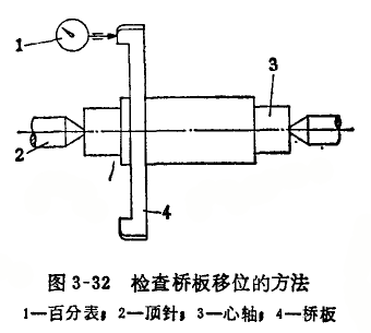 圖3-31b是導向套筒與橋板連接移位的情況,檢查橋板移位的方法如圖3-32所示。將定位護橋的導向套筒安裝的心軸3上,在偏擺檢查儀上用百分表1檢查橋板端面的跳動量,從而測出橋板的位移量。