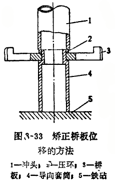 橋板移位,可按圖3-33所示方法,將導向套筒4豎放在鐵砧5上,用榔頭和空心沖頭1沖擊壓環2,矯正橋板的位置。