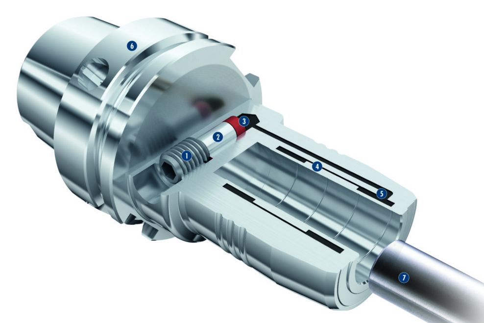?加壓螺栓 ?驅動活塞 ?密封元件?膨脹壁   ?油腔     ?刀柄本體 ?刀具