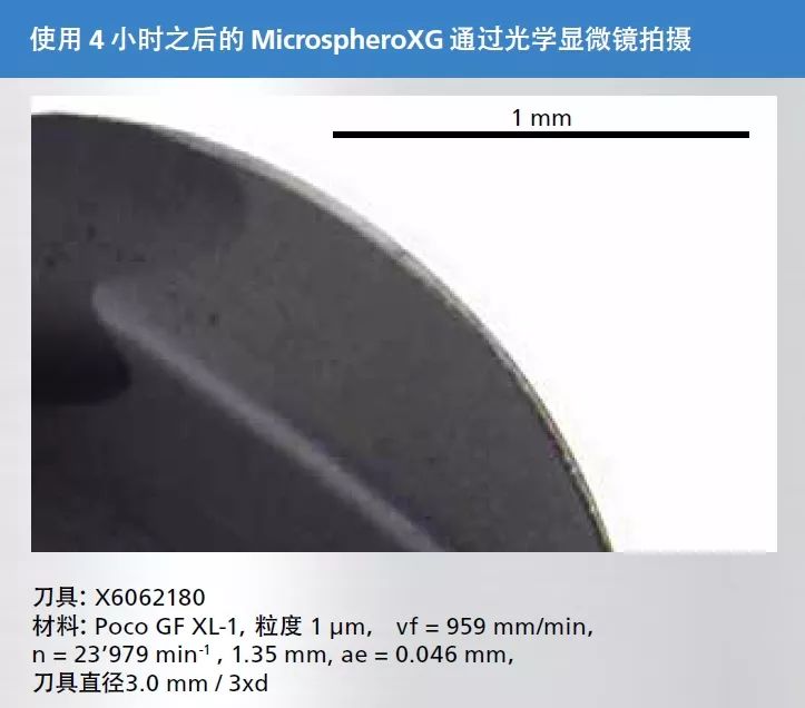 「MicrospheroXG 刀具」在銑削4小時之后,半徑只縮小 4 μm,如此優異的表現得益于廣泛的產品范圍和智能的品類結構——通過硬質合金基體、金剛石涂層、微觀和宏觀幾何結構以及經過優化的 CAM 銑削策略的相互完美協作而實現的。