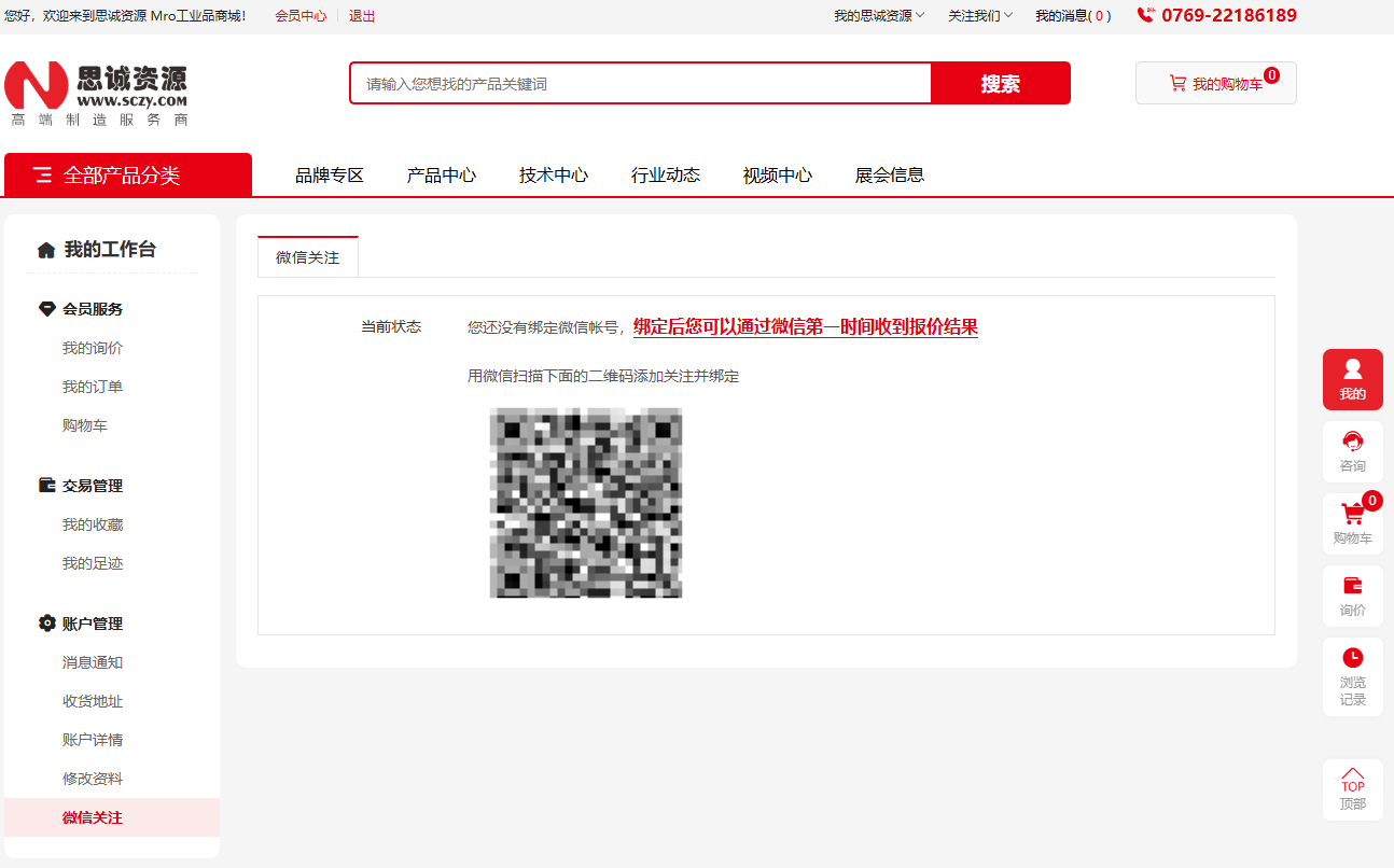 2.3、提交詢價訂單后可根據頁面提示進行微信掃碼綁定,及時接收報價進度等信息