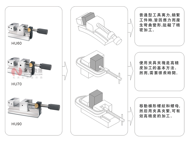 彎曲力抵消系統(tǒng)配備的(內(nèi)藏式變形防止機(jī)構(gòu)),鉗口開/閉使用手柄型之萬力。適用于超精密磨削加工和切割。