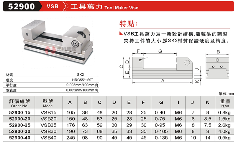 VSB工具萬力為一新設計結構,能輕易的調整夾持工件的大小,采SK2材質保證硬度及精度。