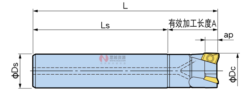 | 刀徑 φDc | 型 號 | φDs | 有效切削刃長 ap | L | 有效加工長度 A | Ls | 刃數 | 對應刀片型號 | 質量 (kg) |