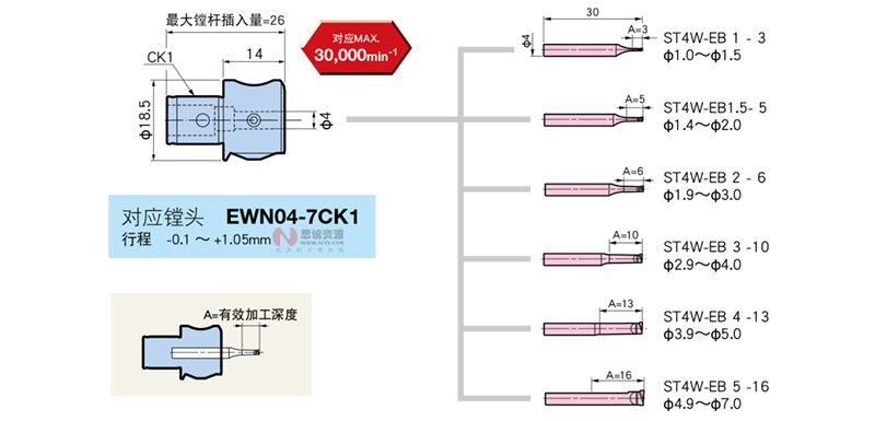 最小外徑φ18.5mm(EWN04-7CK1)的超小徑精鏜頭。 最小微調刻度0.01mm/φ2μm的超精密游標。
