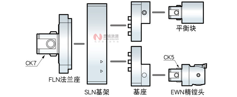 | 加工范圍 φd | FLN 法蘭座 ※ | SLN 基架 | 干涉范圍 | 基座 (2 個 1 組) | EWN 精鏜頭 | 平衡塊 | ||