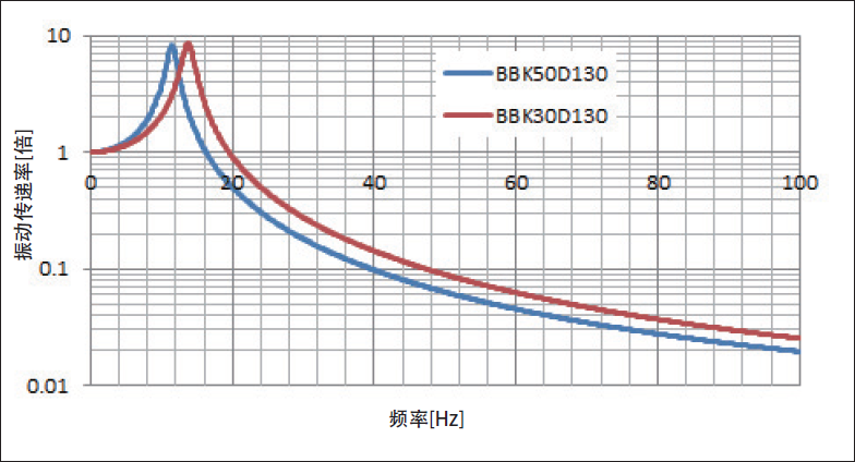 読說明例:振動(dòng)頻率為40Hz時(shí),若使用BBK50D130,振動(dòng)傳遞率為0.1倍,因此振動(dòng)可衰減至1/10。
