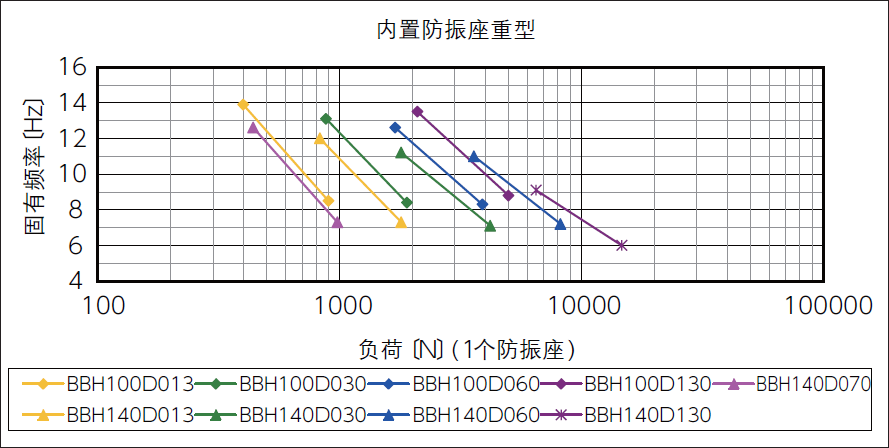 在左側圖表中讀取裝載負荷所對應的防振座固有頻率,選擇需隔振、防振的振動頻率1/2(0.5倍)以下的型號。