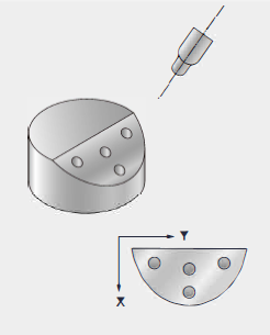 在傾斜面上的開孔加工和形狀加工等程序,只用X — Y平面程序即可, 通過指令坐標回轉 的中心和方向以及角度, 可以進行任意軸系 的坐標切換。