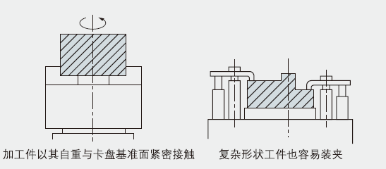 ·由于加工件以其自重與卡盤基準面緊密接觸, 所以從薄型工 件到大直徑 , 重型工件 , 都可以進行高精度穩定的加工。