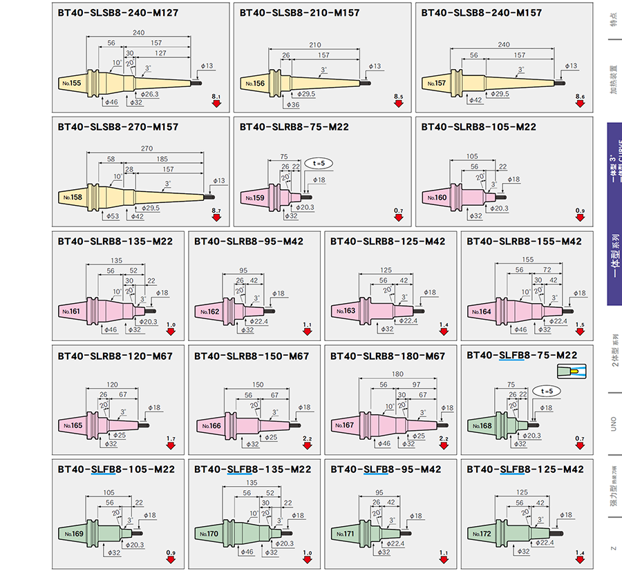| BT40-SLFB8-155-M42 | 一體式熱裝刀柄 | BT40 | 8 | 5 | 155 | 42 | 1.7 | 加購(gòu)詢價(jià) |
