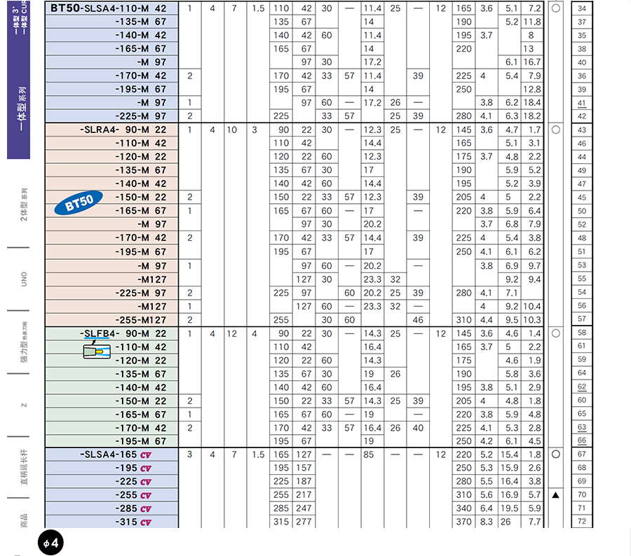 | BT50-SLRA4-110-M42 | 一體式熱裝刀柄 | BT50 | 4 | 3 | 110 | 42 | 3.6 | 加購詢價 |