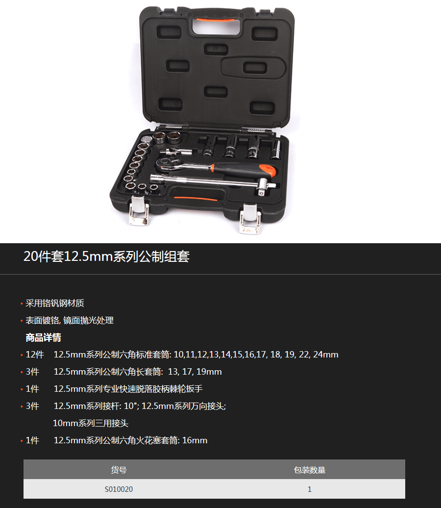 思誠資源為您提供:SHEFFIELD鋼盾 S010020 20件套12.5mm系列公制組套套裝的采購報價、SHEFFIELD(鋼盾)S010020型號參數(shù)、規(guī)格圖片、PDF畫冊等資料,如您想了解更多關(guān)于SHEFFIELD(鋼盾)正品品牌的其他機工工具資料與產(chǎn)品貨期庫存、行情價格,就在思誠資源MRO商城。