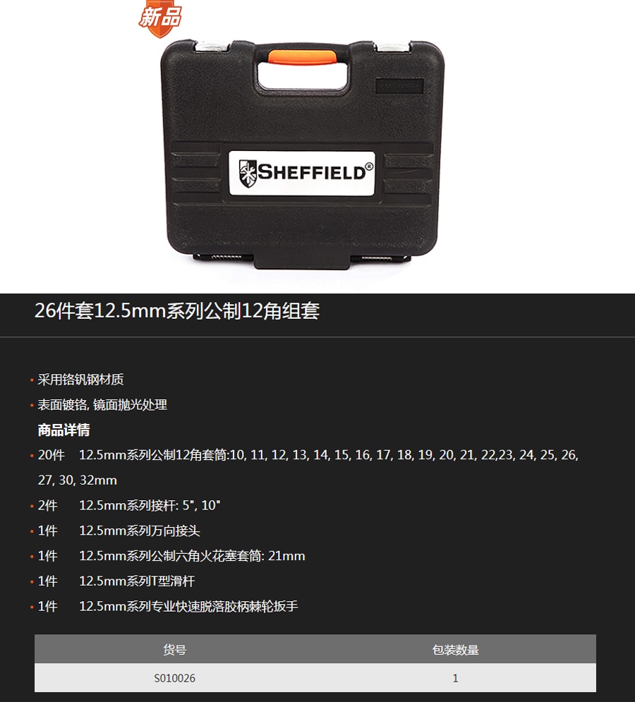 思誠資源為您提供:SHEFFIELD鋼盾 S010026 26件套12.5mm系列公制12角組套套裝的采購報價、SHEFFIELD(鋼盾)S010026型號參數、規格圖片、PDF畫冊等資料,如您想了解更多關于SHEFFIELD(鋼盾)正品品牌的其他機工工具資料與產品貨期庫存、行情價格,就在思誠資源MRO商城。