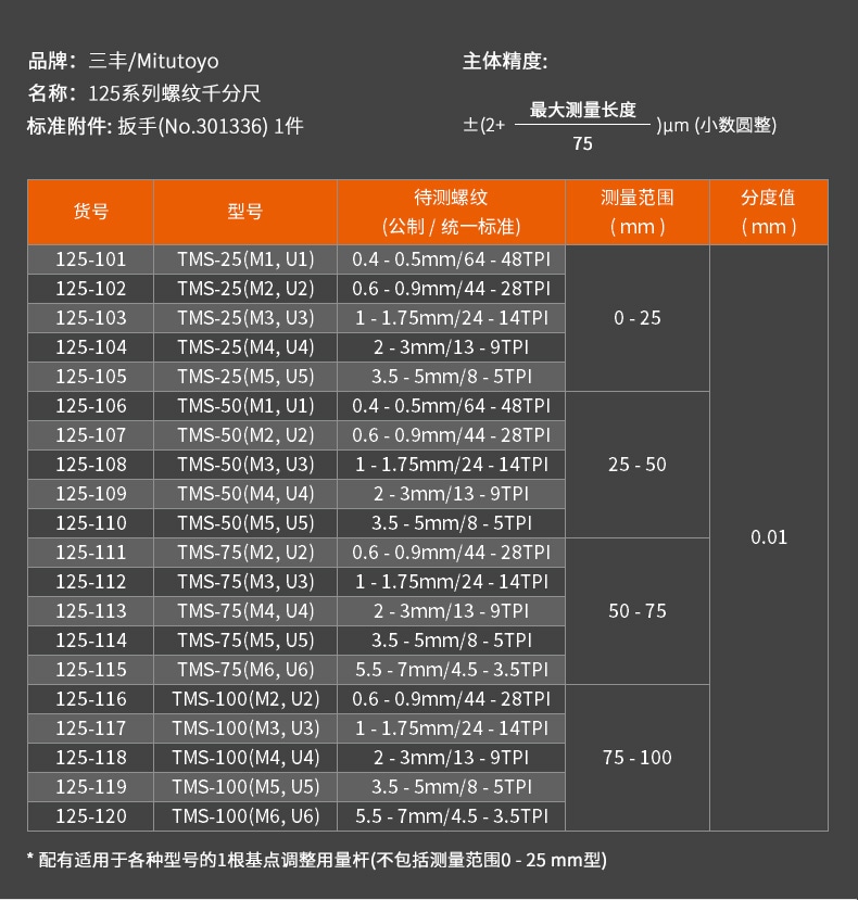 思誠資源為您提供:Mitutoyo三豐 125系列 TMS螺紋千分尺的采購報價、Mitutoyo(三豐)125系列型號參數、規格圖片、PDF畫冊等資料,如您想了解更多關于Mitutoyo(三豐)正品品牌的其他千分尺資料與產品貨期庫存、行情價格,就在思誠資源MRO商城。