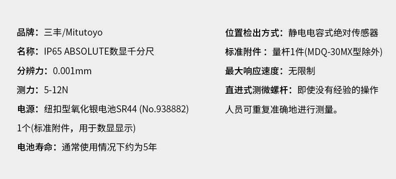 思誠資源為您提供:Mitutoyo三豐 293系列 IP65 ABSOLUTE 數顯千分尺MDQ-MX的采購報價、Mitutoyo(三豐)293系列型號參數、規(guī)格圖片、PDF畫冊等資料,如您想了解更多關于Mitutoyo(三豐)正品品牌的其他千分尺資料與產品貨期庫存、行情價格,就在思誠資源MRO商城。