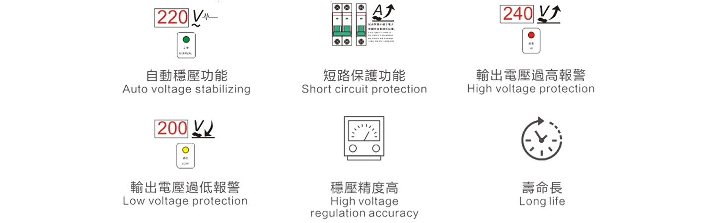 | 保護功能 Protection function | 自動調壓、電壓過高 / 過低報警、短路保護。Automatic voltage stabilization, high /low voltage alarm, short circuit protection |