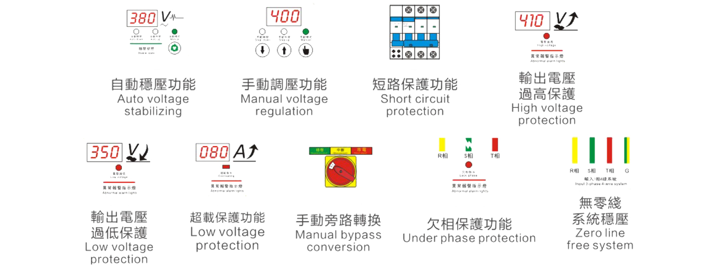 | 保護功能 Protection function | 自動調壓、手動調壓、欠相保鑲、電壓過高 / 過低保鑲、短路保鑲、過載保鑲 Automatic voltage regulation, manual voltage regulation, phase loss protection, overvoltage/undervoltage protection, short circuit protection, overload protection |