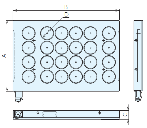 訂貨號 | 型號 | 尺寸A×B×C | 磁極尺寸D | 磁極數 | 吸附力(1個磁極)N | 吸附力(整個面)kN | 附帶控制器 | 重量kg |